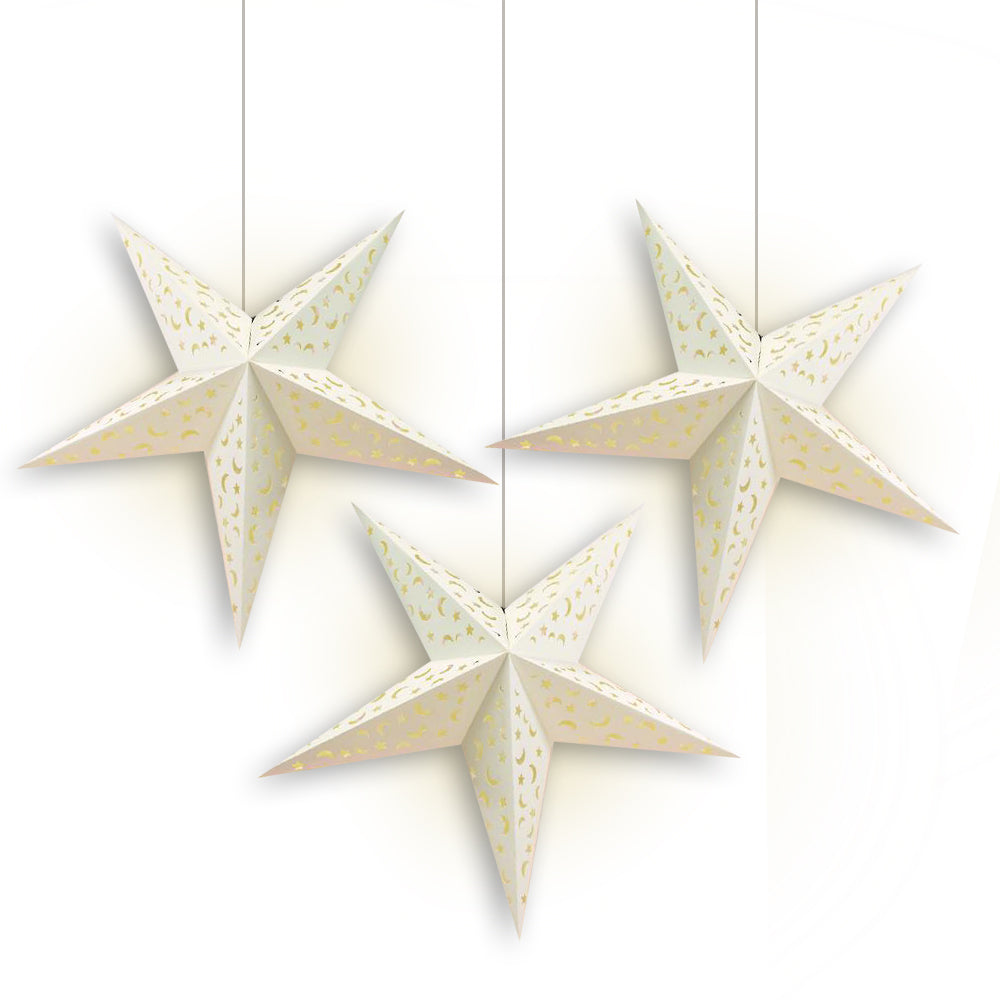 3-PACK White Moon and Stars 24" Illuminated Paper Star Lanterns Hanging Decorations