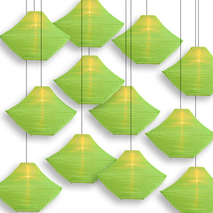 Neon Green Nylon Lanterns in a unique pagoda shape. Lantern is held open with a wire expander.