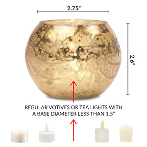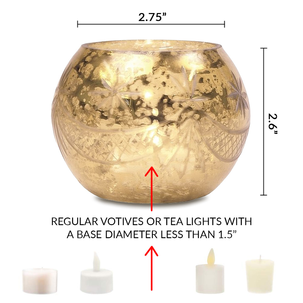 Antique White Mary Mercury Glass Globe Candle Holder - Our rounded mercury glass candle holder have a bough and star etched design. These candle holders will be a great addition to your holiday or wedding reception tables! Product Specifications Measurements: 3.5-inch diameter x 3-inches high. Food Use?: No Candle: For use with battery operated or real tea light *Please Note: As these are hand-crafted items, each piece may vary slightly in appearance from one another.